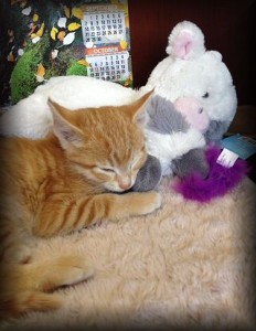 A scruffy, skinny, 5-6 week old, tiny, squeaking, frightened, orange-striped kitten with enormous paws and ears and still-blue eyes. I don’t know who I thought I was kidding when I said “I’d take a look”. As though I’d say, “No, this kitten really doesn’t suit me.”